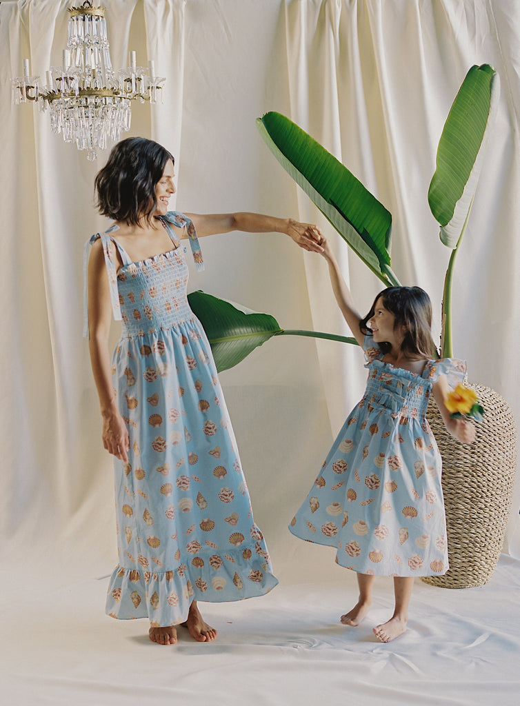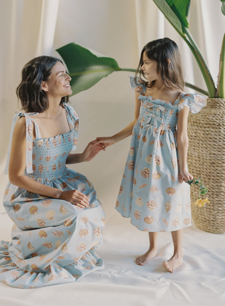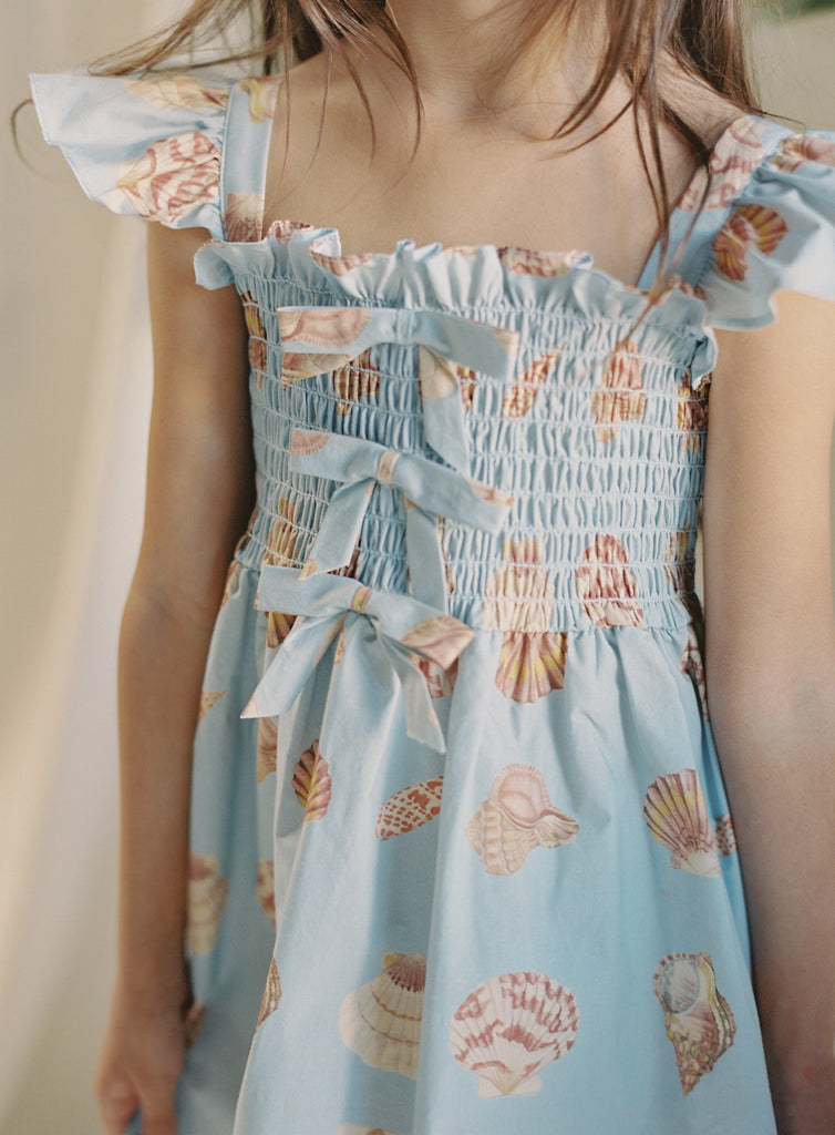 This lighthearted seashell print, cotton dress is perfect for beachside adventures with pockets made to be filled with little treasures. The smocked bodice and charming bows are the final flourish to this darling dress.