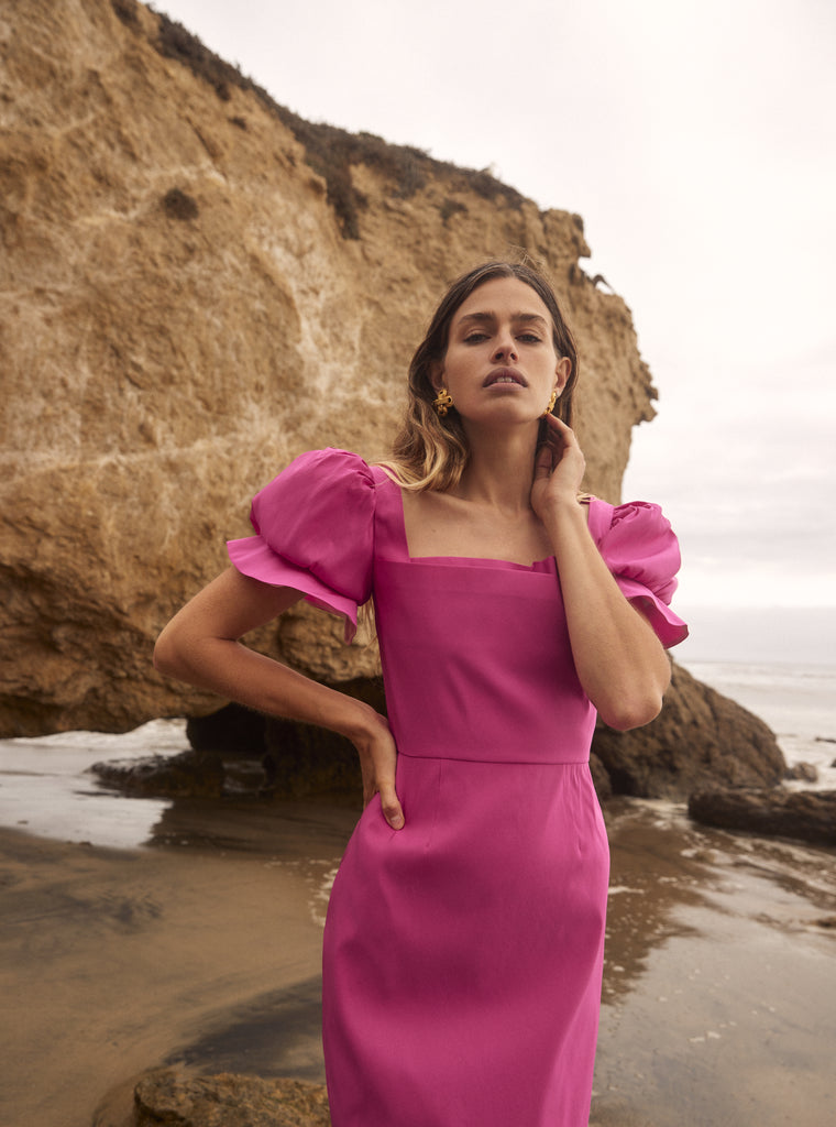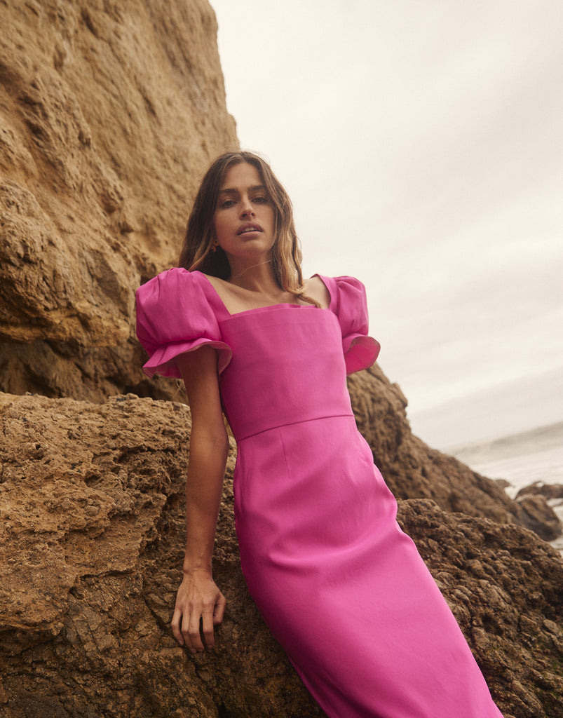 Inspired by vintage corset silhouette's our Dolce Vita dress is a fuchsia dream. The dress features our signature puff sleeves and a slim midi skirt in silk faille.