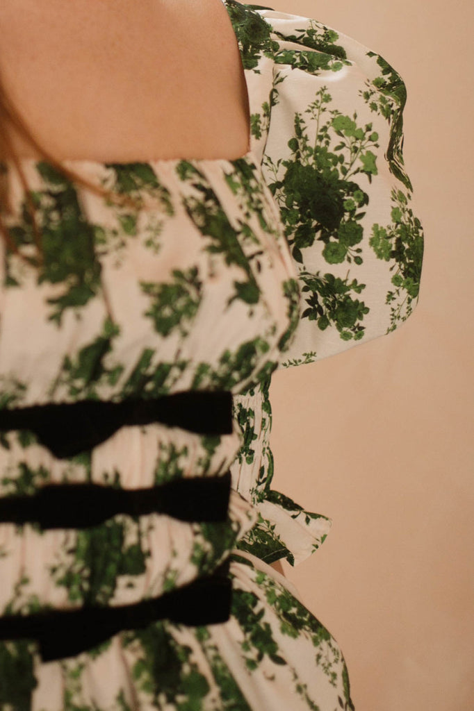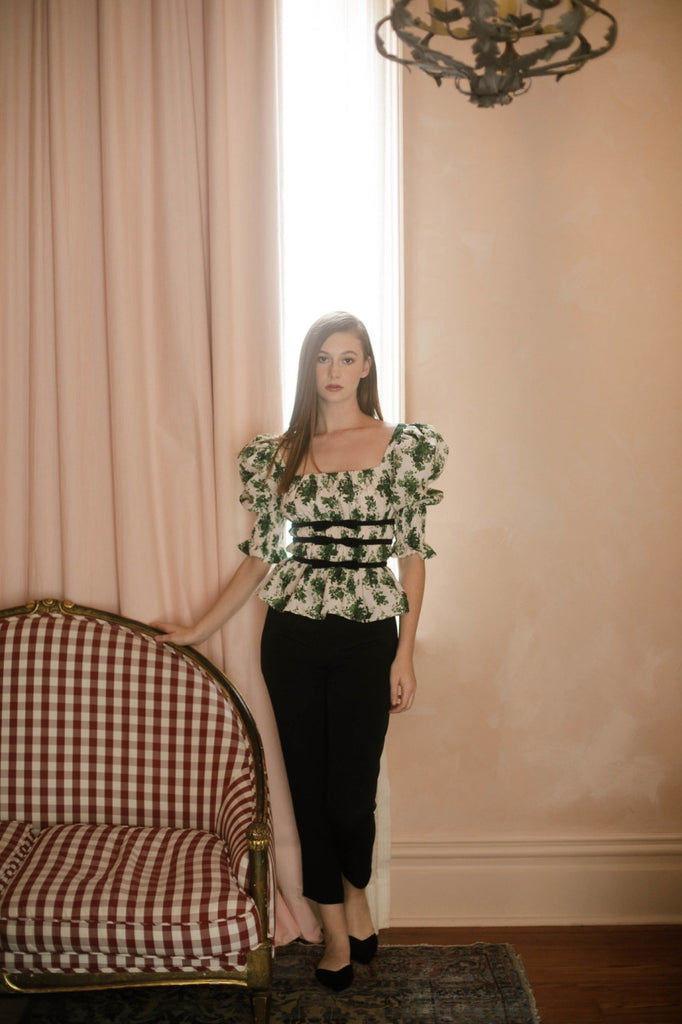 Our classic and captivating Georgia top with its ¾ puff sleeves and form fit, is our must have piece from the collection.  Out Victorian inspired Georgia features rose print patterns taken from an antique tea plate, puff sleeves complete with smocked cuff detail, ruched square neckline, velvet bows around waistline, and a flared hem.