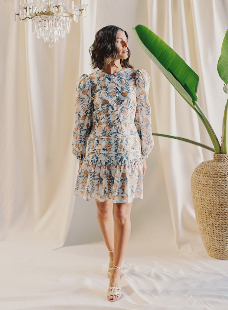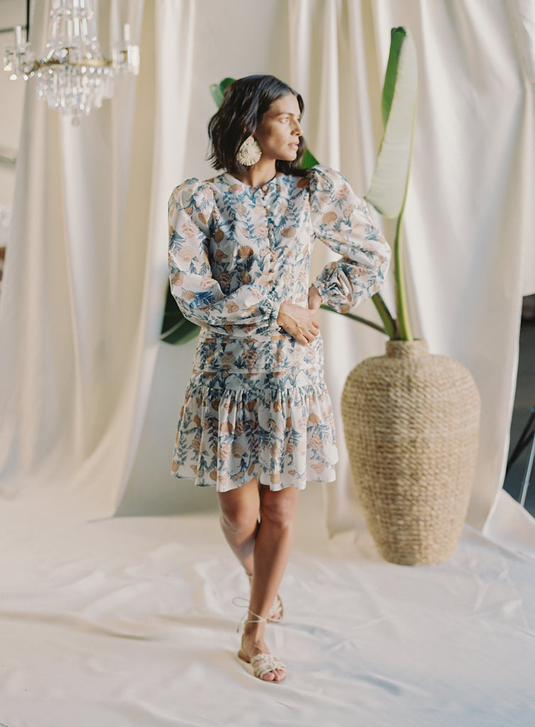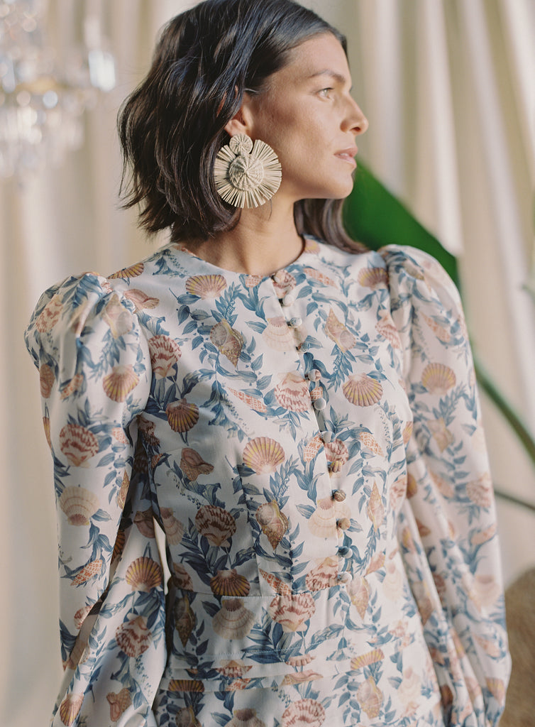 La playa is an enchanting cotton dress with a pleated skirt in our signature print sea shell flora print. The covered buttons are a charming detail, and the zipper in the back provides an ease of use.