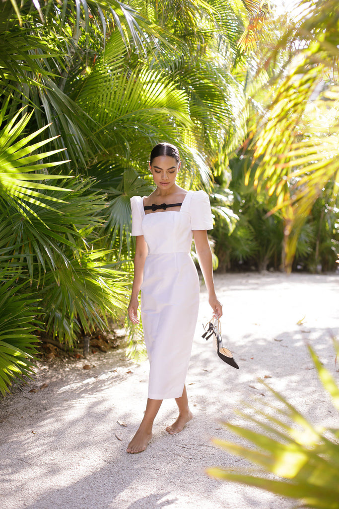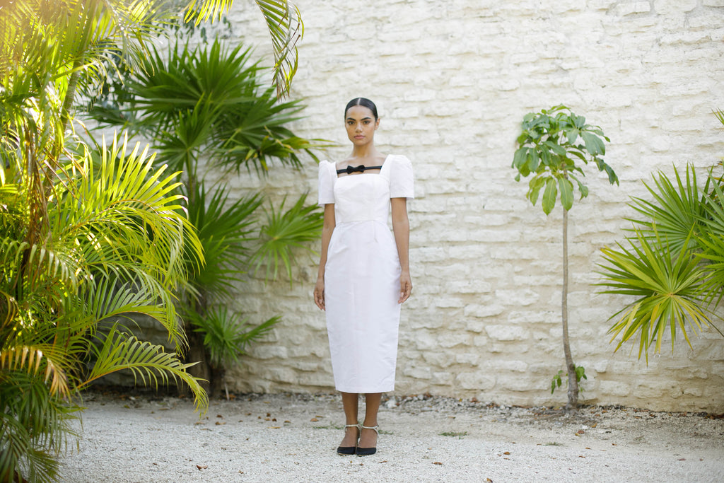 The Lucia is an elegant silk faille dress cut in a modern feminine silhouette.  The dress features structured puckered sleeves with a dainty bow detail.