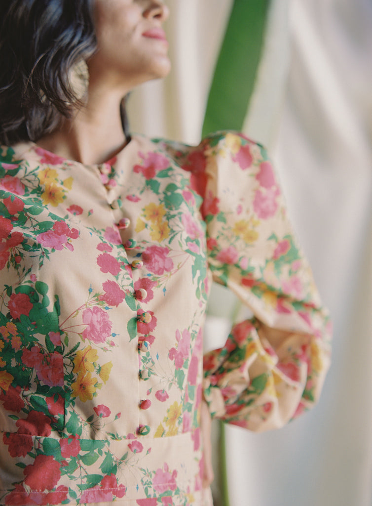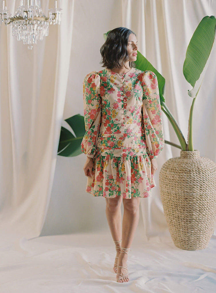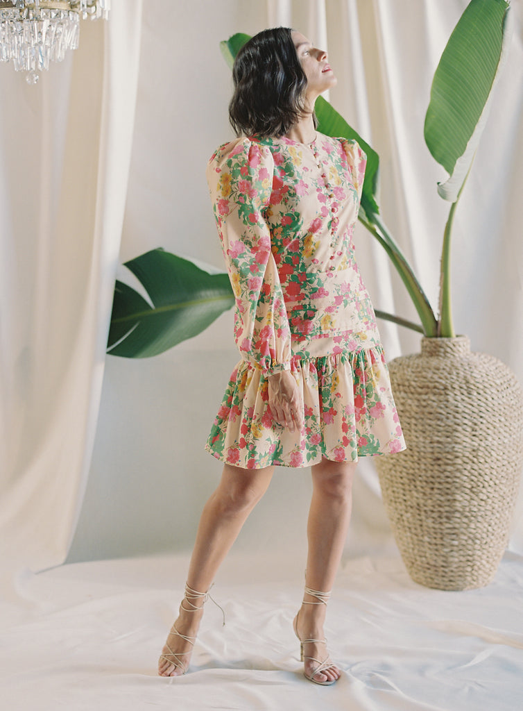 Mi Pina is an enchanting cotton dress with a pleated skirt in our In our signature floral print inspired by Post impressionist artist Paul Gauguin's paintings from the Tahiti Islands. . The covered buttons are a charming detail, and the zipper in the back provides an ease of use.