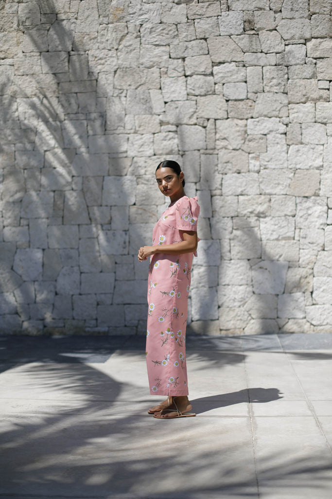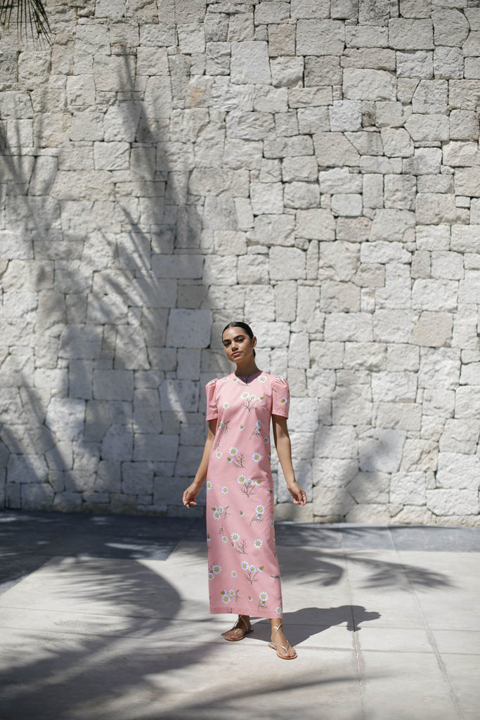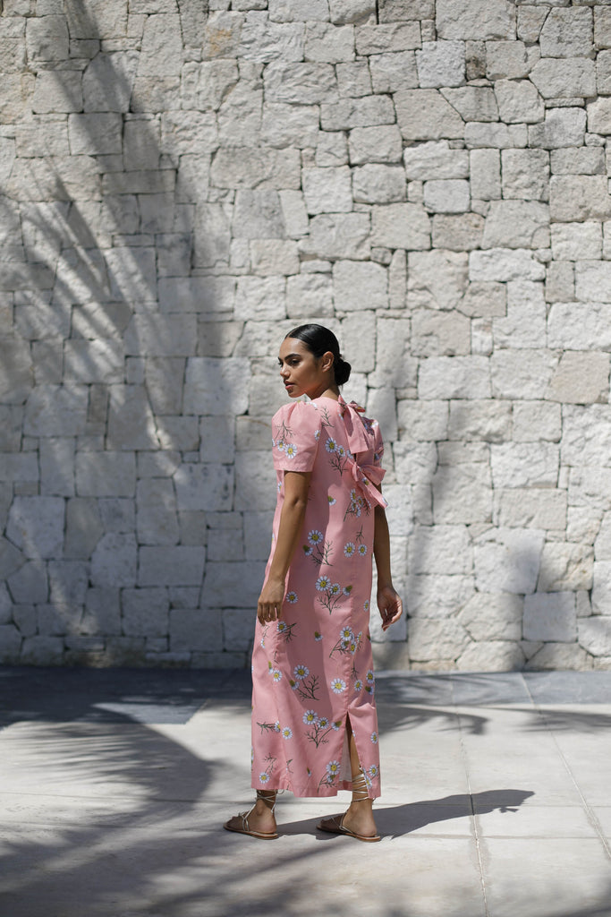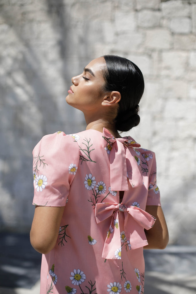 Our Pina dress is a delight for the eyes.  The dress features our signature daisy print designed by Damaris.  Cut in a breezy cotton voile the Pina dress is adorned with two bows that snap in the back.