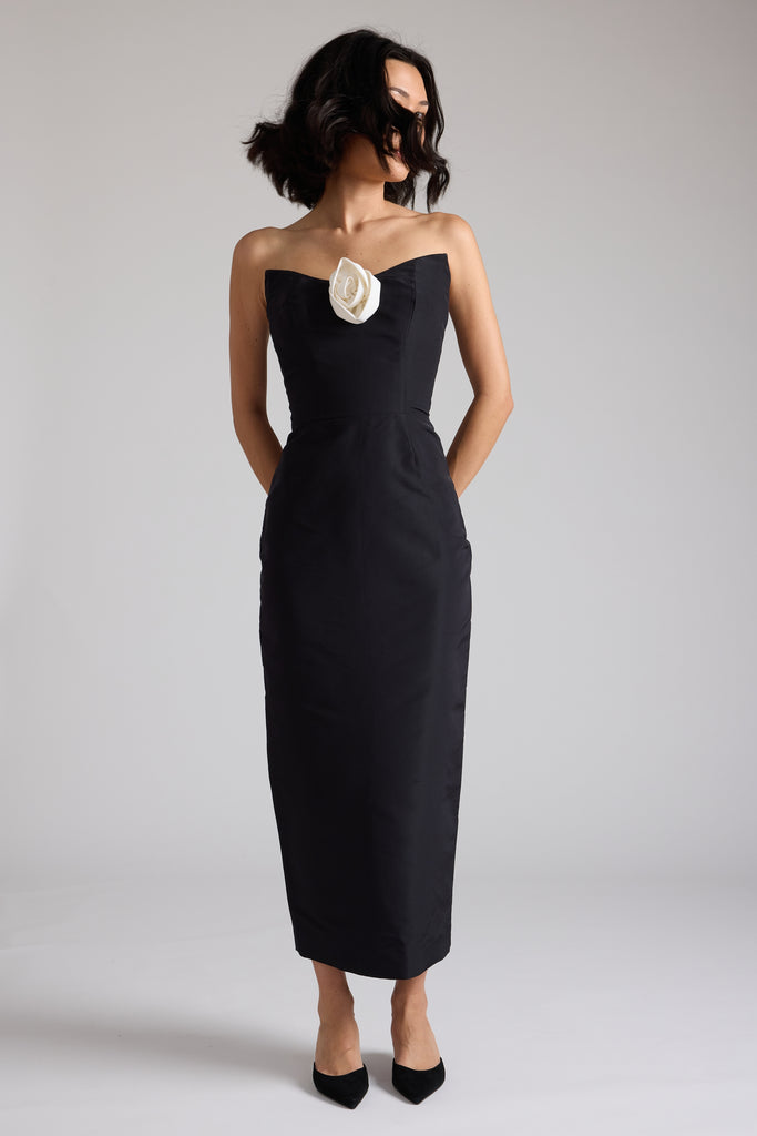The Vivienne Dress evokes the quiet elegance of vintage couture. Crafted in a structured black silk faille that flatters the form, its strapless bodice is adorned with a single hand-cut ivory rosette—a nod to classic femininity. The clean silhouette skims the body, falling to a midi length that transitions seamlessly from candlelit dinners to gallery openings to winter weddings. Poised and polished The Vivienne is perfect for your next occasion.